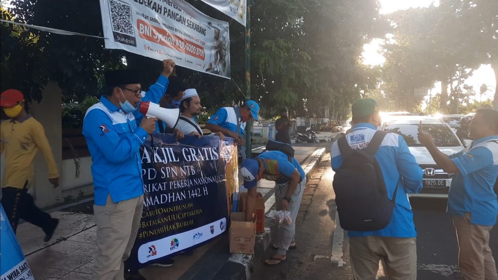 Mataram – Aksi penolakan terhadap Undang – Undang Omnibus Law Cipta Lapangan Kerja masih terus terjadi di tanah air. Aksi ini bahkan digeler serentak oleh Serikat Pekerja Nasional (SPN) meski ditengah bulan puasa Ramadan. Karena berbeda dari biasanya, DPD SPN NTB turun kejalan menyampaikan aspirasinya dengan cara membagikan takjil gratis, kepada pengguna jalan yang melintas di simpang empat masjid Hubbul Wathan Mataram pada Rabu (22/4).
