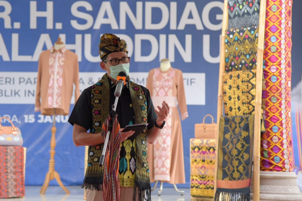 Lombok Tengah – Menteri Pariwisata dan Ekonomi Kreatif (Menparekraf) Sandiaga Salahuddin Uno saat melakukan kunjungan kerja di Lombok Nusa Tenggara Barat pada Jumat (15/1), menyampaikan kebanggannya dengan kerajinan tangan nusantara khususnya sentra kerajinan tenun Desa Sukarara Lombok Tengah yang dikunjunginya. Ia mengatakan, kerjinan tangan tersebut harus tetap dilestarikan, terlebih dalam menyambut Event MotoGP, yang dipastikan akan terlaksana tahun 2021 di Mandalika Lombok.