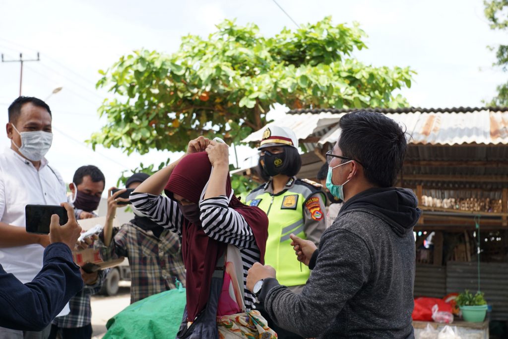 Pembagian Masker menyasar, para pedagang dan pembeli serta kusir Cidomo yang tidak memakai Masker. Alhasil dalam sekejap, ratusan masker habis disebar.
